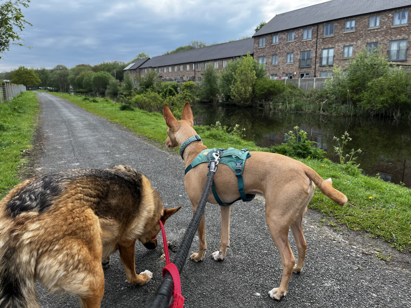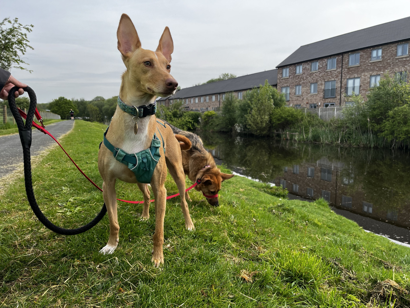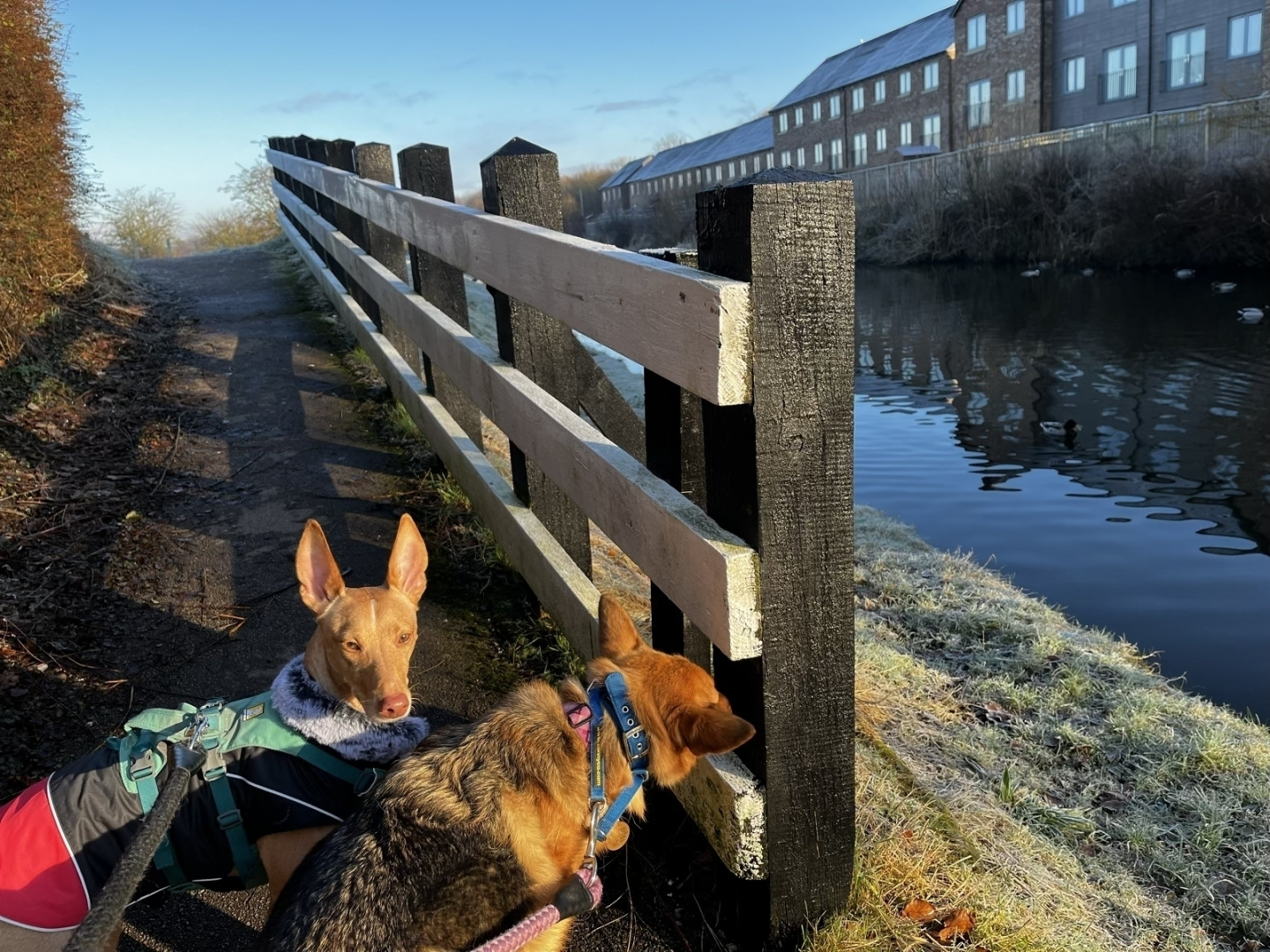 A quick shot of Caoimhe and Leo from their morning walk today on the Leeds Liverpool Canal near Reedley Marina. Caoimhe is getting excited about a potential breakfast top-up on the tow-path. 🔖#podencos #dailydog