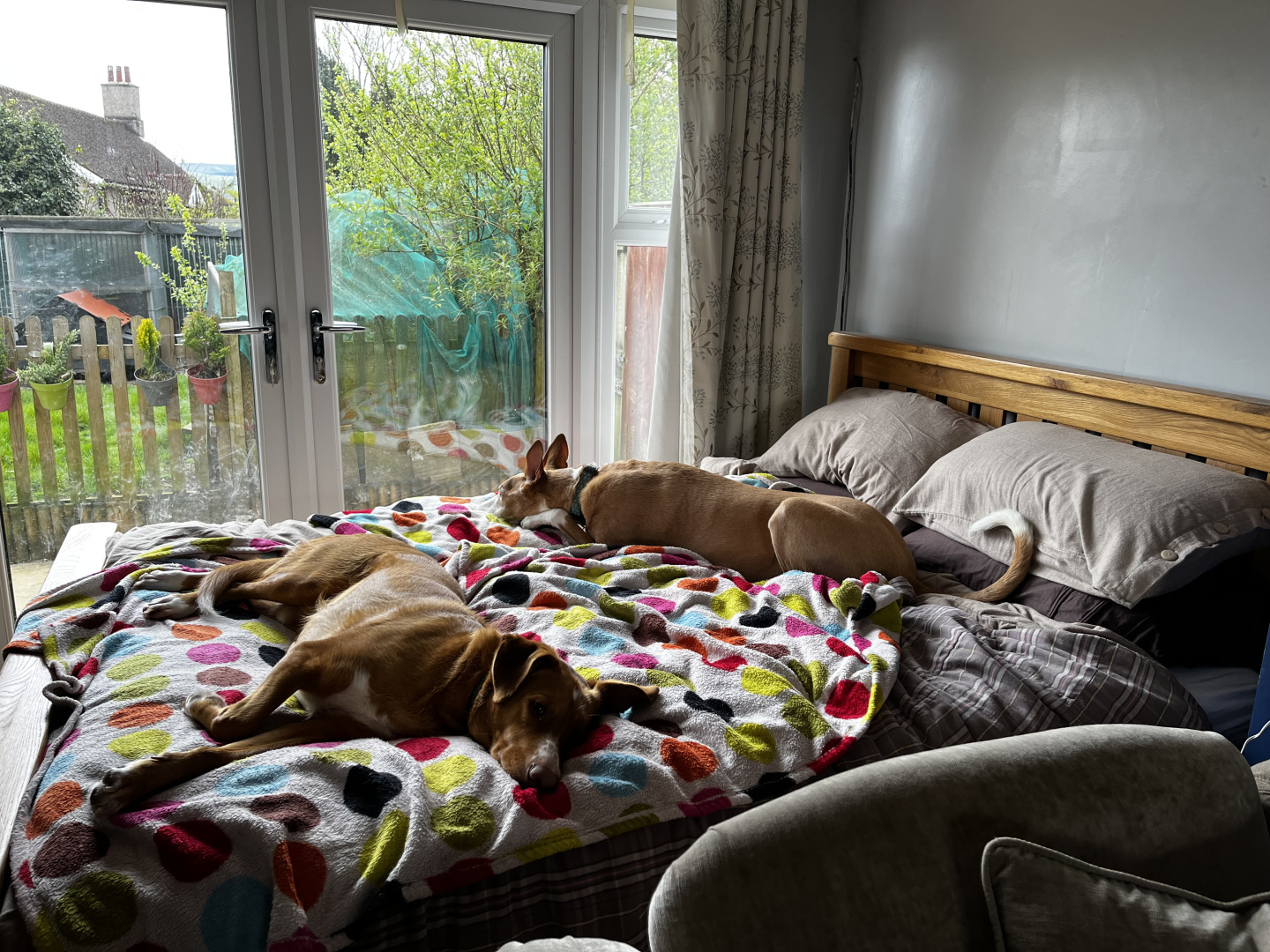 Here are bayLee and Stevie sunbathing in bed, in the living room / office. 🔖#podencos #dogsofmastodon #officeDogs