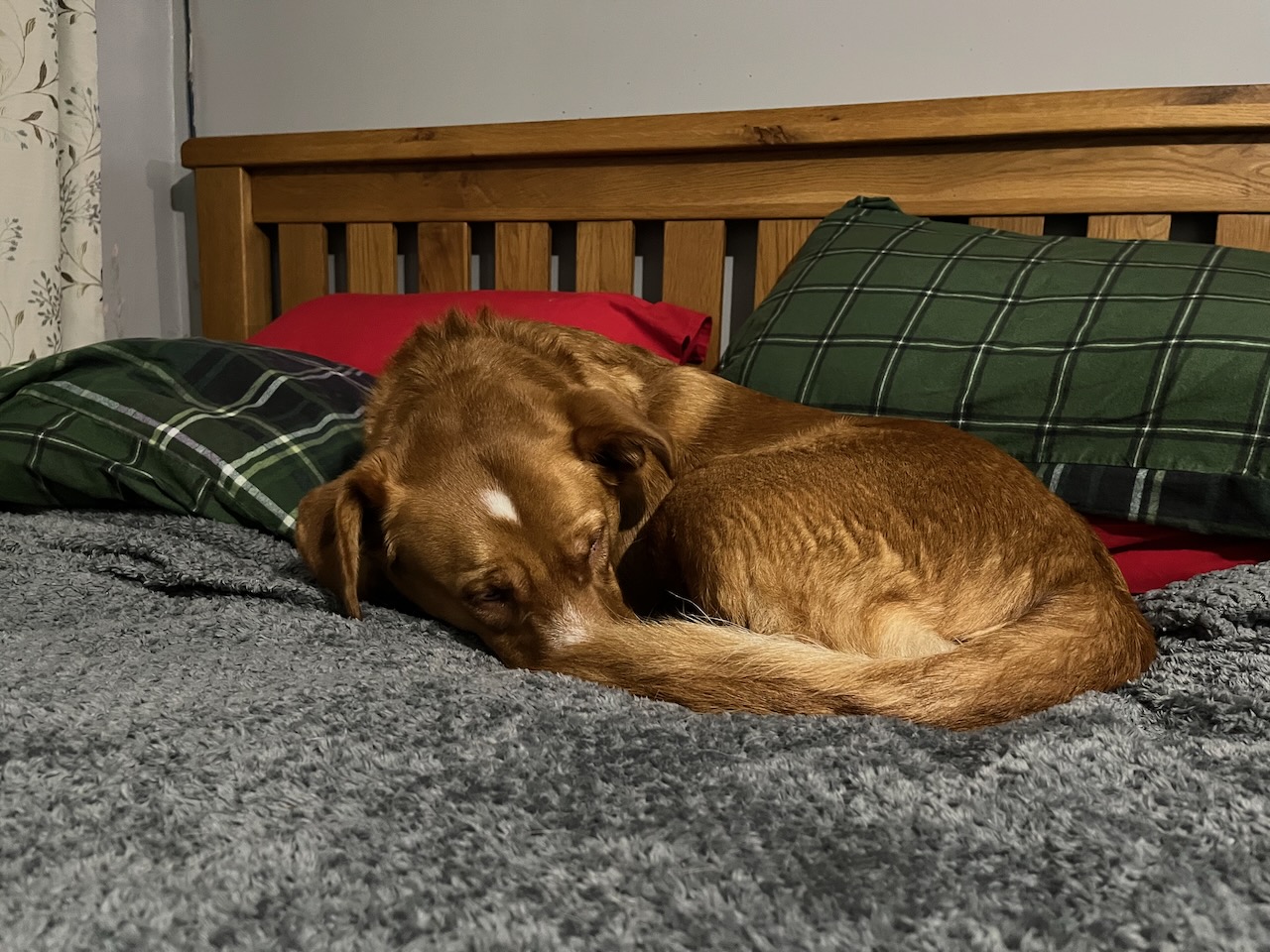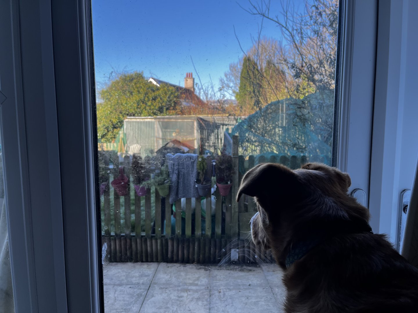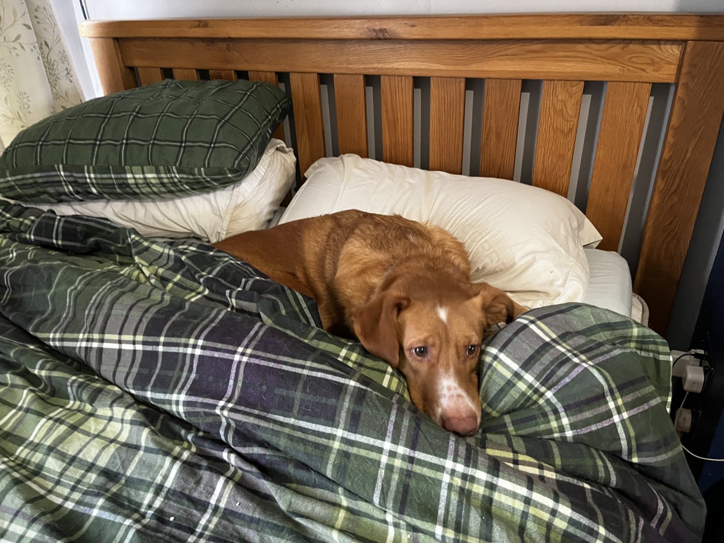 Stevie has just had a glass shard removed from his paw, while Caoimhe has barely left his side while he has been grumpy with it.